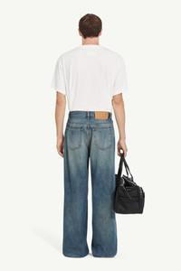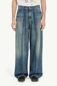 Wide-leg trousers in washed denim with an exaggerated silhouette. Distinct fading emphasises the oversized cut, while seamed panel construction disrupts the familiar five-pocket form. Finished with a tan logo patch and the MM6 white stitch line at the back. Product Details Item ID SH0LA0011M30055961 Primary fabric: 100% cotton Pocket lining: 65% polyester 35% cotton Full-length wide-leg fit Center button and zip closure White stitch line at the back