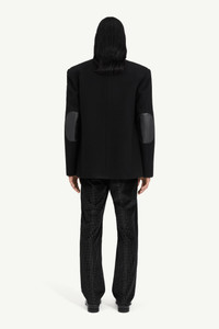 This wool blend blazer distorts tradition with sculptural shoulders and a sharp, abbreviated cut. Contrast elbow patches in smooth coated fabric recall archival patchwork and reimagined function. At the back, a horizontal white stitch line marks MM6’s signature. Product Details Item ID SH2AM0043M35469900 Primary fabric: 80% virgin wool, 20% polyester Blazer in structured wool blend Notched lapel collar Two-button front fastening Flap pockets Contrast elbow patches White stitch line at the back Made in Italy Model is 188 cm tall and wears a size 48.