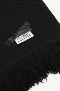 Knitted in a soft wool blend, this ribbed scarf features fringe trim and the numeric signature label. A strip of glossy tape – drawn from MM6's archives – partially conceals the artwork, lending a subversive finish to the familiar form. Product Details Item ID SH2TE0004M13168900S Primary Fabric: 80% Wool, 20% Polyamide Ribbed scarf in a wool blend Fringe trim at both ends Numeric signature label with tape overlay Made in Italy
