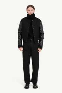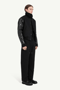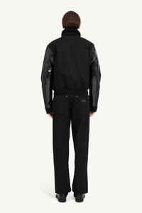 A pared-back varsity jacket defined by contrast. The reversible style is made from a matte wool-blend body and coated, high-gloss sleeves, creating a play between texture and tone. Snap fastenings and ribbed trims underscore the silhouette’s stripped-back appeal. Finished with MM6’s discreet white stitch line at the back. Product Details Item ID SH2AM0040S52207900 Primary fabric: 80% wool, 20% polyamide Varsity jacket in wool blend with coated-effect sleeves Front snap button fastening Ribbed collar, cuffs and hem Side welt pockets White stitch line at the back Made in Italy Model is 186 cm tall and wears a size 48.
