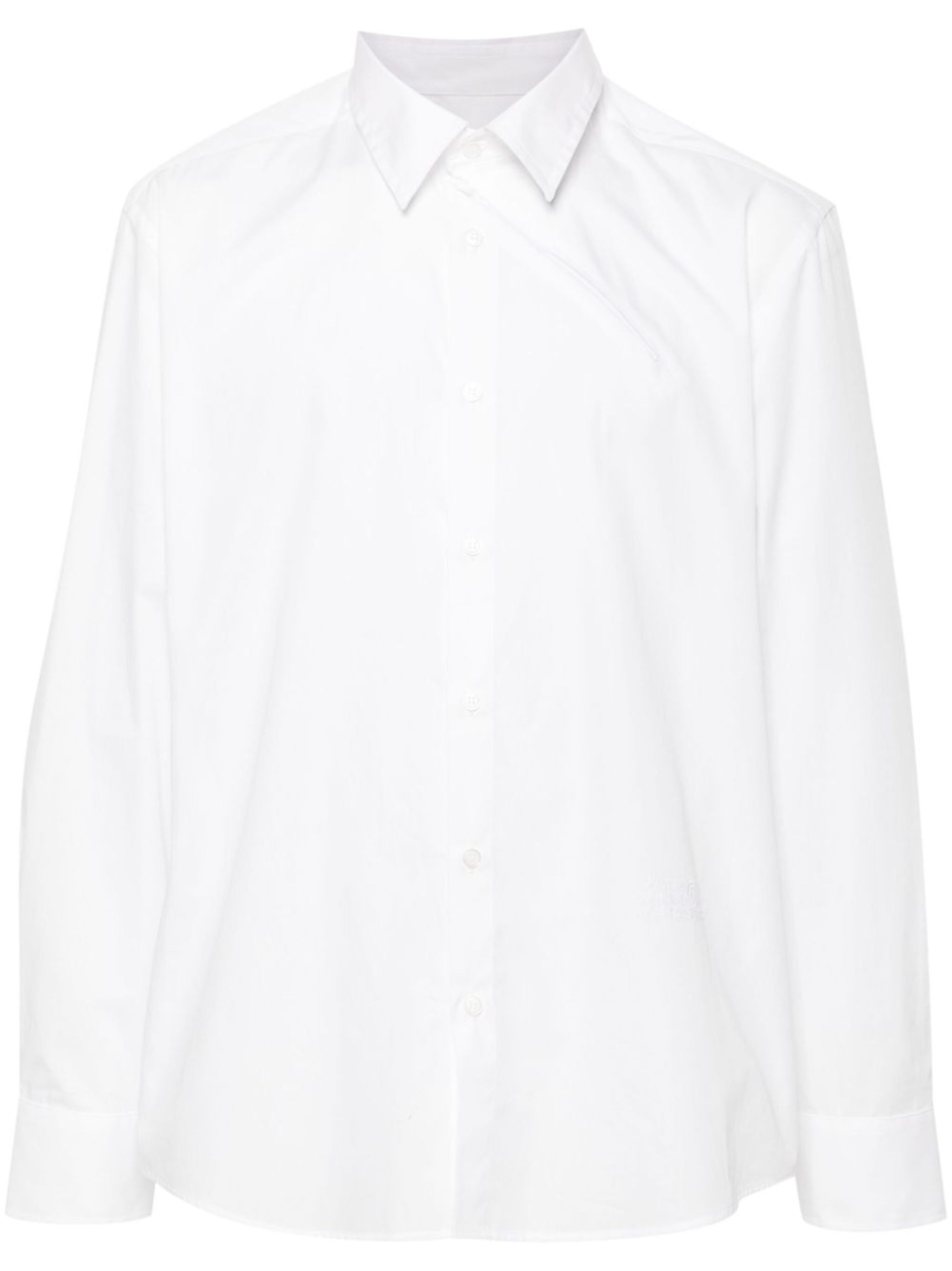 white cotton poplin texture classic collar long sleeves with buttoned cuffs decorative zip detailing signature numbers motif embroidered to the front curved hem front button fastening Size & Fit Model Measurements: Bust: 0cm Height: 0cm Hips: 0cm Waist: 0cm Fabric and Care Designer Style ID: SH0DT0010M35152 Designer Colour: 100 WHITE Composition: Cotton 100% Washing instructions: Read Manufacturer Guidelines Made in Italy