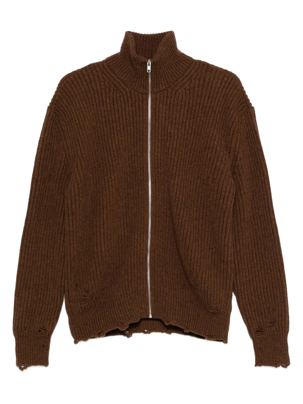 zip-front frayed cardigan Highlights - Brown - Ribbed knit - Zip fastening - Frayed edges - High neck - Long sleeves Made in Italy Composition Wool 100%, Polyamide 20% SIZE & FIT Model measurements Height 6 ft 1 in(1.85 m) Bust/Chest 35.82 in(91 cm) Hips 37.79 in(96 cm) Waist 29.13 in(74 cm) Washing instructions Dry Clean Only