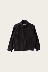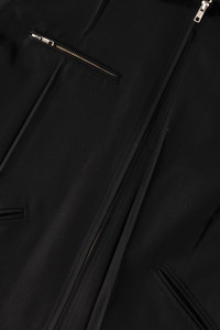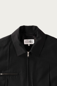MM6 reworks a familiar zip jacket with a sculptural approach to tailoring. The clean front is interrupted by intentional darting and stitched folds that create movement and dimension across the surface. The result is a piece that feels minimal at first glance but reveals a thoughtful pattern cut and a strong sense of shape. The fabric has a smooth, structured hand that holds the silhouette without feeling rigid. A two way zipper and angled pockets round out the design with everyday function. - Structured woven fabric with a smooth finish - Front darting and paneled construction - Two way front zipper - Angled welt pockets and a zip chest pocket - Relaxed fit with a modern shape - Signature MM6 interior branding - Black