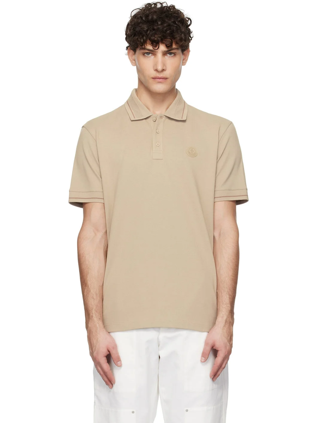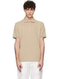 Organic cotton pique polo. · Stripe at rib-knit spread collar and cuffs · Three-button placket · Rubberized logo patch at chest · Vented side seams Supplier color: Sand Beige 100% cotton. Made in Turkey 251111M212000