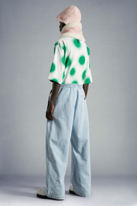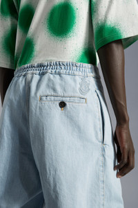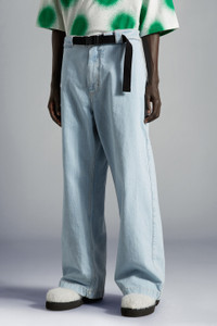 A relaxed design, these gender neutral jeans from the 1 Moncler JW Anderson collection are crafted from bleached denim. An upbeat escapism characterizes the 1 Moncler JW Anderson collection, of which these jeans are a perfect example. Crafted from bleached denim, these jeans boast a loose silhouette and a waistline accentuated with a contrast color ribbon boasting the Moncler Genius collaboration's branding. - Crafted from bleached denim - Internal metal hook and 4-hole button closure, metal zipper - Ribbon waistband with Moncler/JWA branded buckle - Front slit pockets - Back single-welt pocket with 4-hole button closure Felt embroidered Moncler/JW Anderson logo on the back pocket - Elastic waistband SIZE AND FIT - The model is wearing a size 48 and is 186 tall - The model measures: chest 78 cm waist 76 cm hips 85 cm COMPOSITION AND CARE BASE FABRIC: 100% Cotton Hand wash; Do not bleach; Do not tumble dry; Ironing maximum temperature 110°C - without steam; Do not dry clean; Do not professionally wet clean; Flat dry in the shade; Wash separately; do not soak; It is advisable to wash and iron the garment on reverse.; PROTECT TRIMS WHILE WASHING Product code H209E2A00009M1979795 Made in Italy
