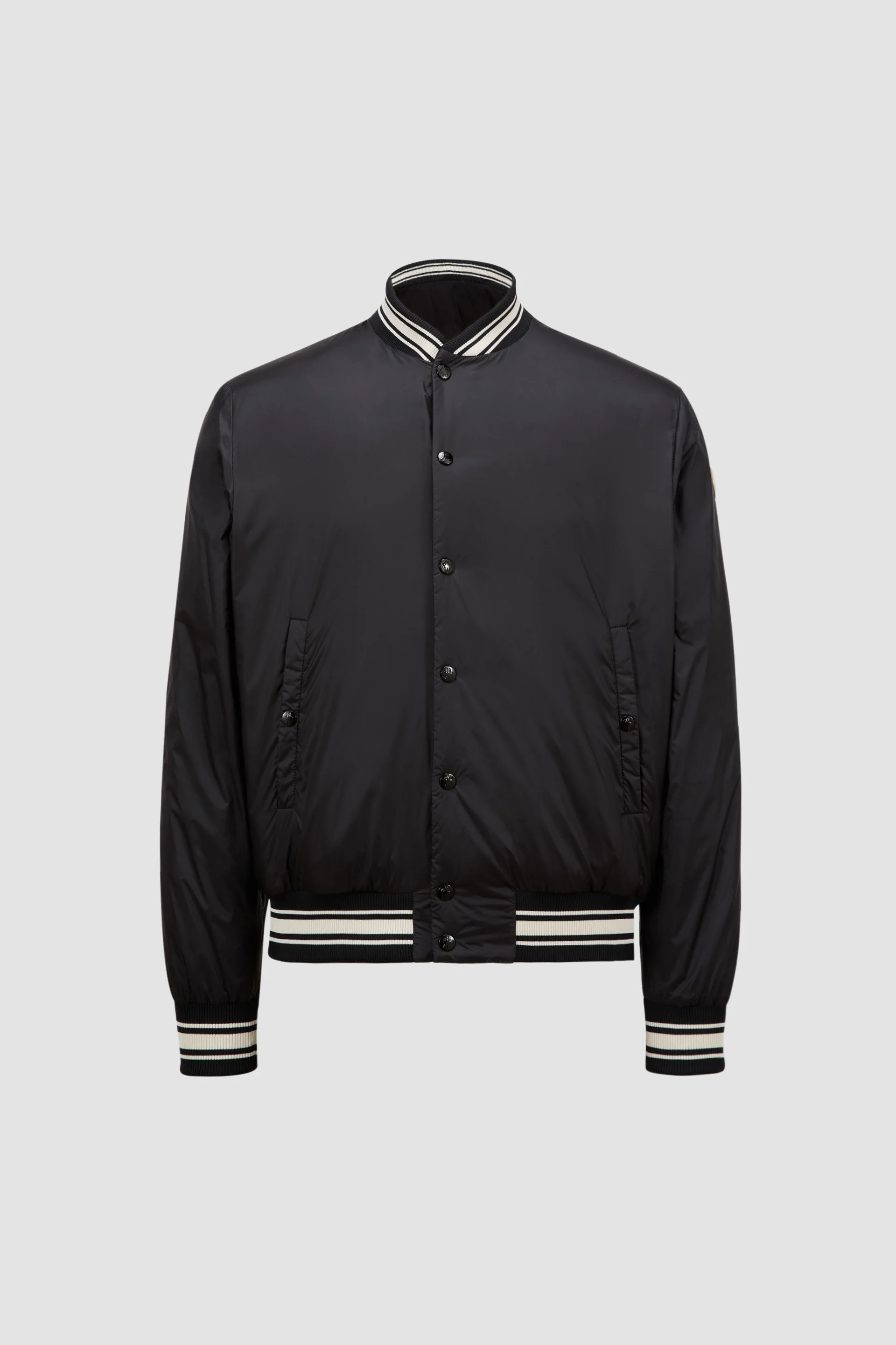 A fresh approach to collegiate style, the Bouchet reimagines the classic men's varsity jacket as a down-filled and reversible design. A nod to letterman jackets, the Bouchet is featured in a characteristic bomber shape with knit trims. Versatile at its core, the reversible down jacket features recycled lightweight nylon fabric on one side and classic cotton jersey on the other. The short puffer is finished by logo patches on each face, completing the warmer's varsity feel. DETAILS - Crafted from recycled longue saison - Cotton jersey lining at the front and back - Reversible - Down-filled - Zipper and snap button closure - Pockets with snap button closure - Striped rib knit trim - Embroidered logo and monogram patches SIZE AND FIT - The model is wearing a size 3 and is 188 cm tall - The model measures: chest 85 cm, waist 71 cm, hips 87 cm - Loose fit COMPOSITION EXTERIOR: 100% Polyamide / Nylon; Ribs: 85% Polyester, 13% Polyamide / Nylon, 2% Elastane / Spandex; LINING: 100% Cotton; SLEEVES LINING: 100% Polyamide / Nylon; PADDING: 90% Down, 10% Feather; DETAILS PADDING: 100% Polyester Product code K10911A00040597YF999 Made in Romania
