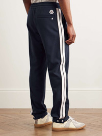 Moncler's tapered sweatpants are part of a vintage-inspired set with the coordinating track jacket in our edit. Cut from fleece-back cotton-jersey, they're traced with sporty stripes down the sides and have elasticated cuffs that adjust with zips and snaps. Size & Fit - Fits true to size. Take your normal size - Tapered leg, low-crotch style - Drawstring at the waist - Adjustable hems - Mid-weight, stretchy fabric - Model is shown wearing a M - Model measures: waist 32, height 6'1"/ 185cm Details & Care - Navy fleece-back cotton-jersey - 100% cotton - Machine wash
