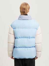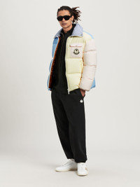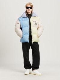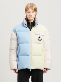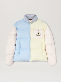 Moncler Genius Palm Angels special collection, limited edition. Color block patchwork down jacket in white and light blue nylon with white and light blue striped collar fastened with Moncler snaps, down filling and Moncler X Palm Angels logo on front pocket, with flap and faux mother-of-pearl snap. Zipper closure and zippered pockets, elastic drawstring hem and metal Moncler cord stopper. Mohamed wears size 2 Height: 6' 2" (185 cm) Bust: 34" (86 cm) Waist: 28" (75 cm) Viktoria wears size 0 Height: 5' 7 1/2" (171 cm) Bust: 31 1/2" (82 cm) Waist: 23" (58 cm) PRODUCT ID: PMEA272T24FAB0014030