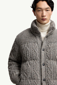 Crafted from tweed, the Moncler Grenoble men's Ellesmere short down jacket adds texture to a winter wardrobe. Infusing mountain leisure with an elegant aesthetic, the Ellesmere down jacket is crafted from Merino wool tweed. Tapping into a relaxed winter mood, the short puffer showcases a textured argyle and cable knit finish. DETAILS - Crafted from Merino wool tweed Rainwear lining Down-filled and padded Argyle and cable knit Gauge 1.5 Snap button closure Side pockets SIZE AND FIT - The model is wearing a size L and is 188 cm tall - Regular fit COMPOSITION BASE FABRIC: 100% Virgin wool; LINING: 100% Polyamide / Nylon; PADDING: 90% Down, 10% Feather; DETAILS PADDING: 100% Polyester Product code K20979B00004M7568984 Made in Romania