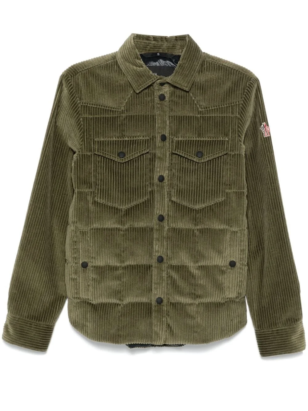 Gelt down shirt jacket Highlights - Olive green - Cotton blend - Goose down - Corduroy - Padded design - Front press-stud fastening - Classic collar - Logo patch at the sleeve - Long sleeves with press-stud fastening cuffs - Two chest press-stud fastening flap pockets - Two side stud-fastening pockets - Full lining - Curved hem Imported Composition Outer: Polyester 100%, Cotton 98%, Elastane 2% Lining: Goose Down 90%, Goose Feather 10% Washing instructions Dry Clean Only
