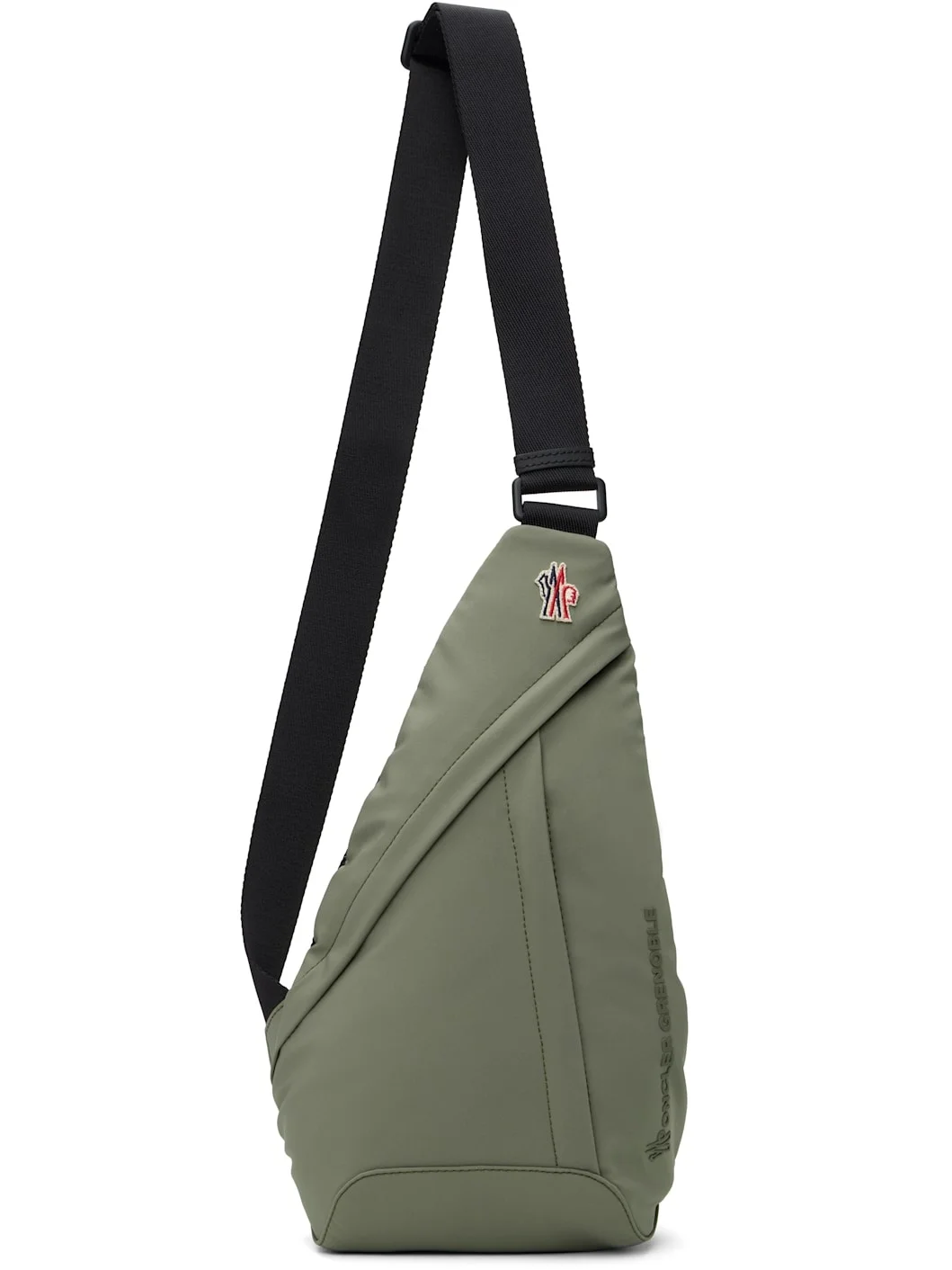 Nylon drill single-shoulder backpack in green. · Water-repellent · Embroidered logo patch at face · Zip pocket at face · Rubberized logo bonded at face · Padded mesh panel at back face · Zip closure · Taffeta lining · H15" x W9.25" x D4.75" Supplier color: Laurel wreath Body 1: 87% polyamide, 13% elastane. Body 2: 100% polyester. Lining: 100% polyamide. Made in Romania 251826M166001