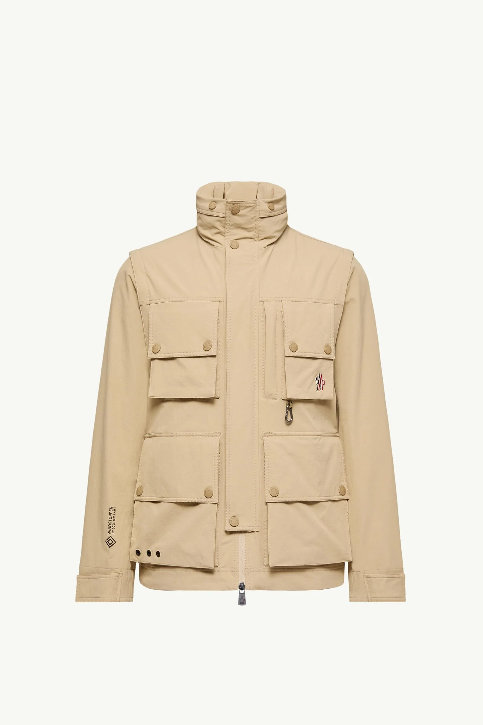 With detachable sleeves and a water-repellent finish, the Moncler Grenoble Lione 2-in-1 field jacket for men is designed for the great outdoors. A multi-functional designed optimized for technical performance, the Lione field jacket is a 2-in-1 piece. It stands out for its detachable sleeves and pull-out hood, instantly adapting to whatever the weather may bring. A smart finishing touch, the warmer is completed by utility pockets and a detachable carabineer for mountain essentials. DETAILS - Designed for trekking and hiking - Crafted from stretch nylon blend - 2L liner Windstopper® by GORE-TEX LABS® lining - Pull-out hood - Detachable sleeves - Zipper and snap button closure with flap - Utility pockets with snap button and zipper closure - Detachable carabiner - Printed logo and reflective details SIZE AND FIT - The model is wearing a size 3 and is 188 cm tall - Loose fit - Length (collar to hem): 74 cm COMPOSITION BASE FABRIC: 90% Polyamide / Nylon, 10% Elastane / Spandex; LINING: 100% Polyamide / Nylon Product code L10971B00001597ED204 Made in Romania