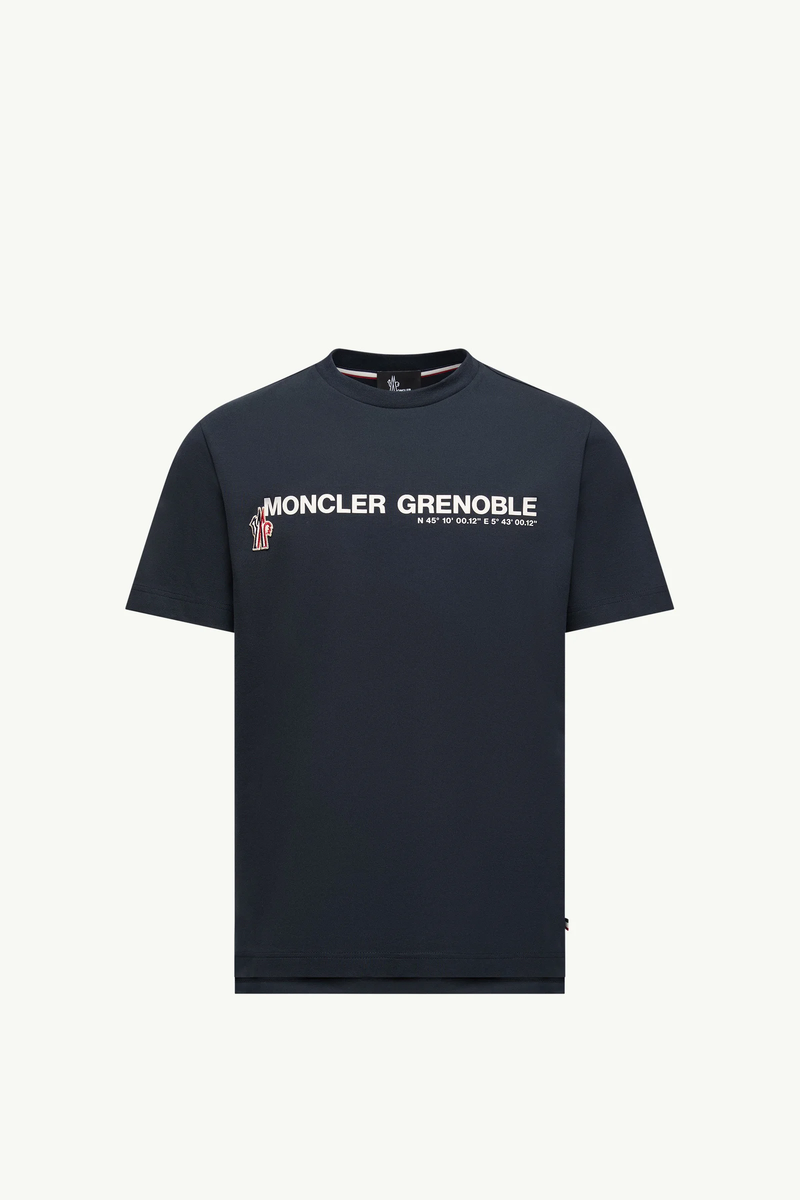 A men's Moncler Grenoble design, this short sleeve t-shirt captures the collection's adventurous spirit with a logo print. An essential layer for the city or the mountain, this short sleeve t-shirt is crafted from soft cotton. Drawing from the brand's heritage, the crew neck is embellished with a printed logo that features the coordinates of the city of Grenoble. DETAILS - Crafted from cotton stretch jersey - Ribbed crew neck - Short sleeves - Embossed and printed logo motif SIZE AND FIT - The model is wearing a size L and is 188 cm tall - Slim fit COMPOSITION BASE FABRIC: 95% Cotton, 5% Elastane / Spandex; Ribs: 95% Cotton, 5% Elastane / Spandex Product code K20978C0000189AW1740 Made in Turkey