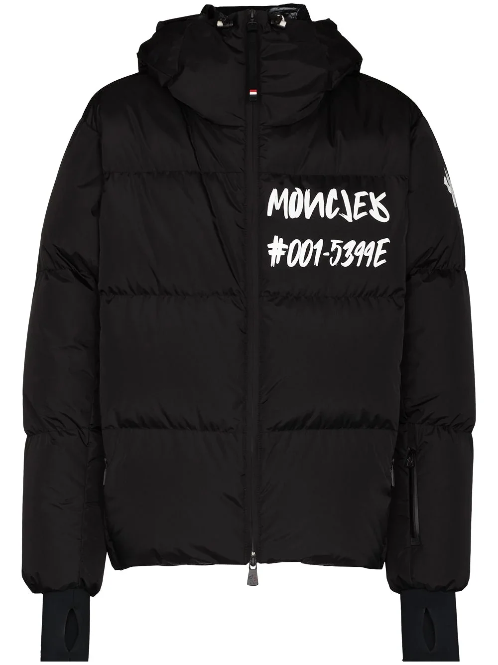 Mazod zip-up puffer jacket Moncler's focus on performance is reflected in the insulating down-feather filling of this jacket. This functional design is paired with contemporary style thanks to the piece's bold logo-print detailing. Imported Composition Outer: Polyamide 100%, Elastane 100%, Leather 100%, Polyester 100%, Feather Down 100% Lining: Polyester 100% Washing instructions Hand Wash