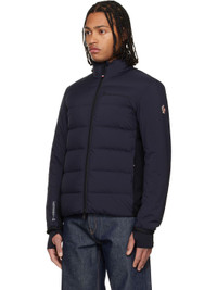 Down-filled and quilted nylon taffeta and stretch interlock jersey jacket. · Lightweight, water-repellent, and windproof · DIST-certified down · Paneled construction · Stand collar · Two-way zip closure · Rubberized logo at chest · Zip pockets at waist · Primaloft®-insulated sleeves and back · Elasticized hem and cuffs · Embroidered logo patch at sleeve · Text printed at cuff and back hem · Thumbhole at inset stretch jersey cuffs · Zip pocket at interior · Fully lined Supplier color: Navy Body: 100% polyamide. Trim 1: 93% polyester, 7% elastane. Trim 2: 83% polyamide, 17% elastane. Fill 1: 90% goose down, 10% feather. Fill 2: 100% polyester. Lining: 89% polyester, 11% elastane. Made in Romania 252826M178006