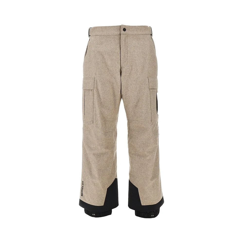 Ski pants made from padded and waterproof technical wool flannel. Adjustable waist with straps and elasticated back. Zip fly and hook closure. Slanted welt pockets and maxi cargo pockets with zip and flap on the sides. Rubberized logo patch on the left leg. Regular fit. DETAILS Model code: K20972G00008 Color code: 229 Season: FW25 Material: 100% WV Made in: Romania Sku: 29256 Color: Beige Brand: MONCLER GRENOBLE