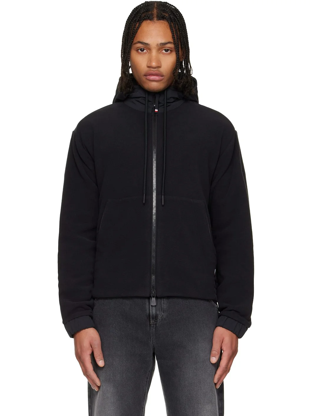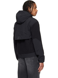 Paneled Polartec® fleece and taffeta hoodie. · Drawstring at hood · Two-way zip closure · Patch pockets at front · Elasticized hem and cuffs · Embroidered logo patch at chest · Adjustable press-stud tab at cuffs · Storm flap at back · Fully lined Supplier color: Black 100% polyester. Made in Romania 252826M202008