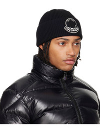 Rib-knit virgin wool beanie. Embroidered logo patch at rolled brim. Supplier color: Black 100% virgin wool. Made in Italy 252111M138004