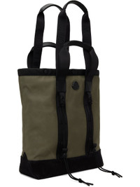 Canvas and suede tote in khaki and black. · Rolled carry handles · Rolled logo-woven shoulder straps · Logo patch at face · Cord-lock drawstrings at face · Webbing daisy loops at face and back · Press-stud closure · Zip and patch pockets at interior · Satin lining · H15.25" x W16.5" x D5" Supplier color: Kalamata Textile, leather. Made in Romania 251111M172008