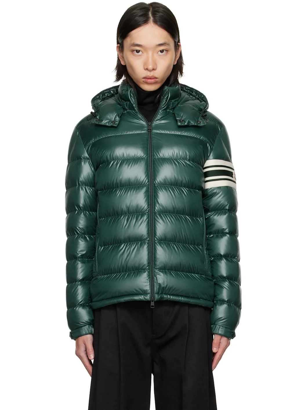 Quilted down-filled satin jacket. · Detachable hood · Stand collar · Two-way zip closure · Zip pockets at waist · Knit sleeve cuff with embroidered logo · Adjustable press-stud cuffs · Zip pocket at interior · Satin lining Supplier color: Sea moss Fill: 90% down, 10% feathers. Body: 100% polyester. Made in Romania 252111M178033