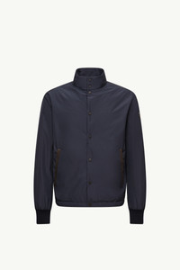 Crafted from innovative fabrics, the Lanques short down jacket for men pairs a streamlined shape with technical performance. Elegant yet practical, the Lanques short down jacket is crafted from Aquaflect. The technical fabric is notable for its excellent shape-retaining qualities and water-repellent protection. Adding a precious finishing touch, the warmer is completed by a nubuck leather trim and wool cuffs. The piece's sophisticated shape and protective qualities allow it to adapt effortlessly to city days or leisure time in nature. DETAILS - Crafted from Acquaflect - Airsoft lining - Down-filled - Zipper and snap button closure - Zipped pockets with nubuck leather trim - Inner patch pocket with snap button closure - Wool cuffs - Leather logo patch SIZE AND FIT - Regular fit - Fitted shoulders and chest - Boxy waistline - Length (collar to hem): 69 cm COMPOSITION EXTERIOR: 100% Polyester; Cuffs rib: 89% Virgin wool, 10% Polyamide / Nylon, 1% Elastane / Spandex; LINING: 100% Polyester; PADDING: 90% Down, 10% Feather; BODY PADDING: 100% Polyester;LEATHER TAG: COW; LEATHER OUTER APPLICATION: COW Product code K20911A00071597Y3742 Made in Romania
