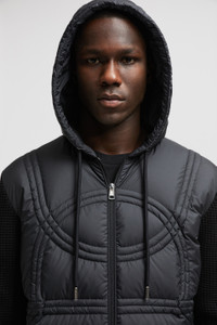 Straight from the courts, this cotton hoodie for men is embellished with a quilted pattern inspired by the world of basketball. Recalling the curved shapes seen on the basketball course, this cotton hoodie features a quilted geometric logo pattern. The mid-weight cardigan is enhanced with a down-filled nylon front, allowing the piece to double as outerwear in milder weather. DETAILS - Crafted from cotton - Lightweight micro chic nylon lining - Down-filled and padded micro chic nylon front - Waffle stitch - Gauge 7 - Polyester hood - Zipper closure - Pockets with snap button closure SIZE AND FIT - The model is wearing a size L and is 188 cm tall - The model measures: chest 95 cm, waist 77 cm, hips 90 cm - Regular fit - Fitted shoulders and chest - Boxy waistline COMPOSITION OUTER FRONT: 100% Polyester; BASE FABRIC: 100% Cotton; HOOD LINING: 100% Polyester; FRONT LINING: 100% Polyester; HOOD: 100% Polyester; PADDING: 90% Down, 10% Feather; DETAILS PADDING: 100% Polyester Product code K10919B00015M1367999 Made in Turkey