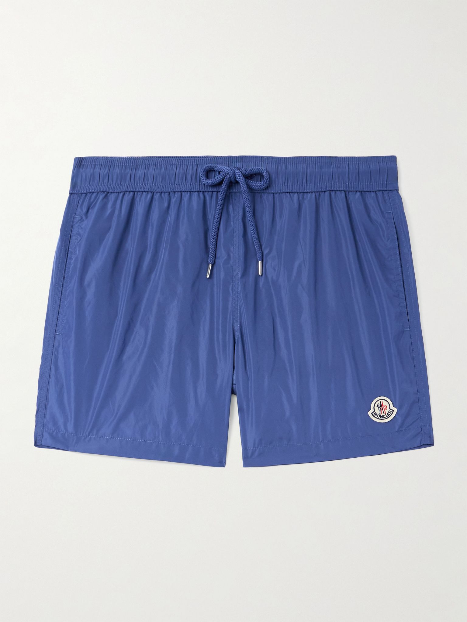 Moncler's swim shorts will look smart on the beach and beyond. This straight-leg pair is cut from quick-drying shell and accented with the brand's recognisable crest patch and signature stripes along the back zipped pocket. Size & Fit - Fits true to size. Take your normal size - Straight leg, mid-rise style - Mid-length - Built-in mesh briefs - These shorts are adjustable at the waist - Model is shown wearing a M - Model measures: waist size 32, height 6'2"/ 188cm Details & Care - Blue shell, multicoloured webbing - 100% polyester - Machine wash
