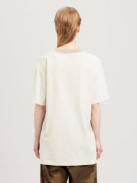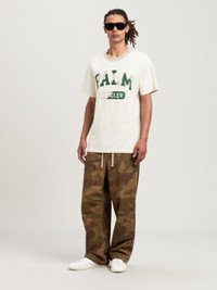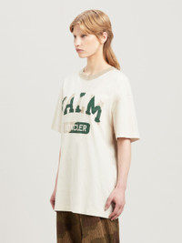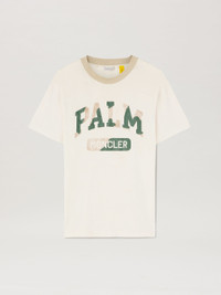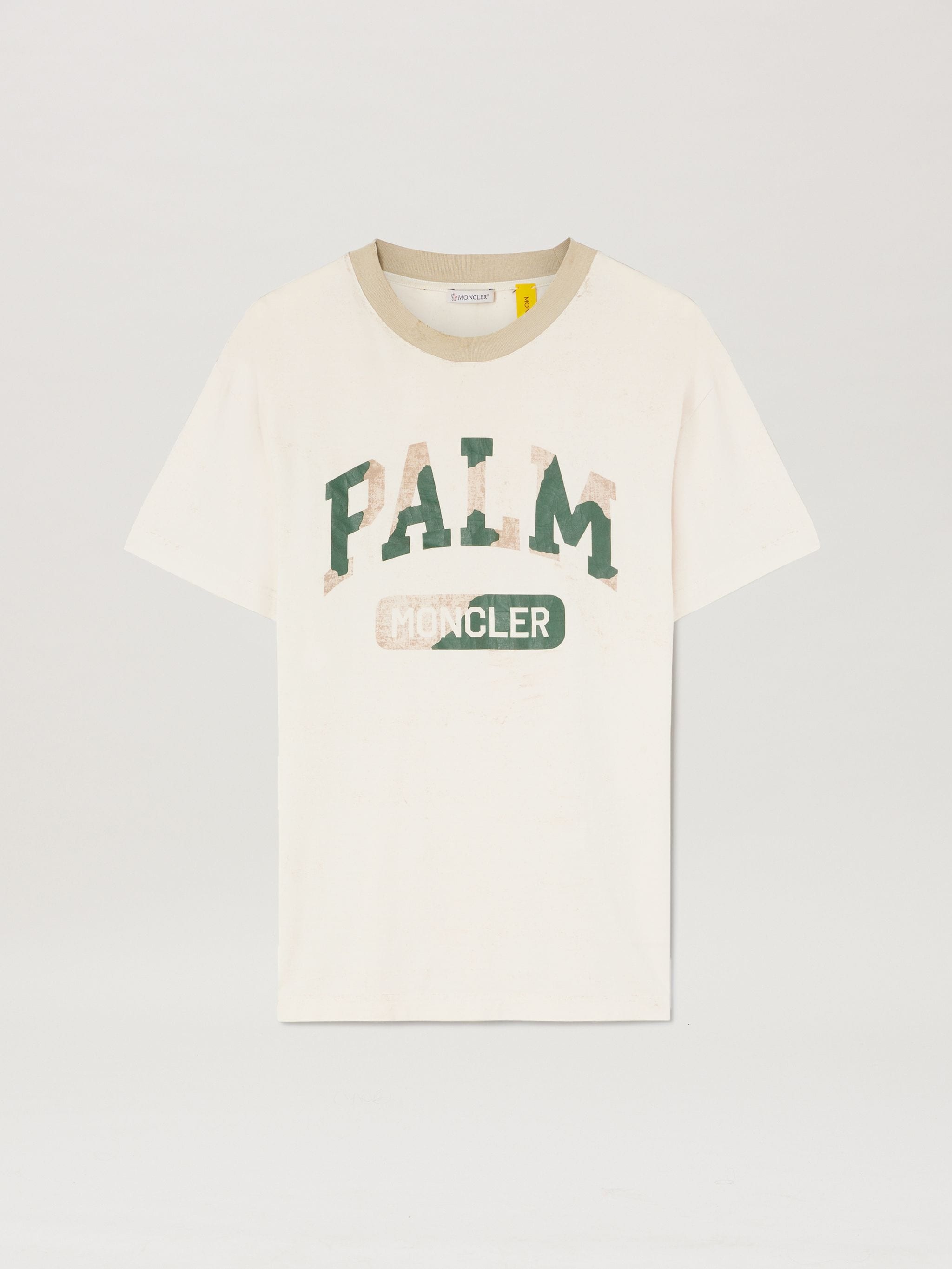 Moncler Genius Palm Angels Special Collection, limited edition. White short-sleeved T-shirt with Palm and Moncler lettering in beige and green camouflage on front, contrasting beige collar with micro craks and stains for a vintage effect. Mohamed wears size M Height: 6' 2" (185 cm) Bust: 34" (86 cm) Waist: 29" (71 cm) Viktoria wears size S Height: 5' 7 1/2" (171 cm) Bust: 31 1/2" (82 cm) Waist: 23" (58 cm) PRODUCT ID: PMAA098T24JER0010155