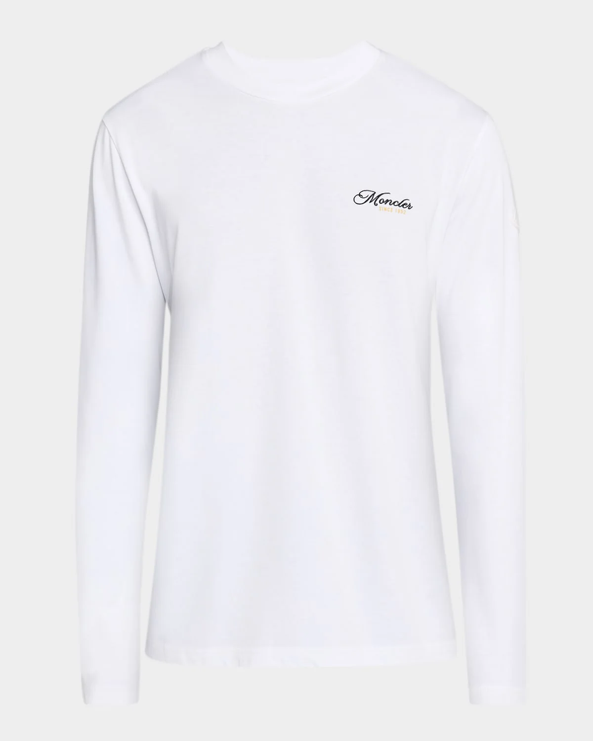 - Solid, yet casual, this Moncler long-sleeve shirt is accented by logo script on the front and back. - Crew neckline - Long sleeve - Embroidered logo on the left arm - Pullover style - Cotton - Machine wash cold - Imported
