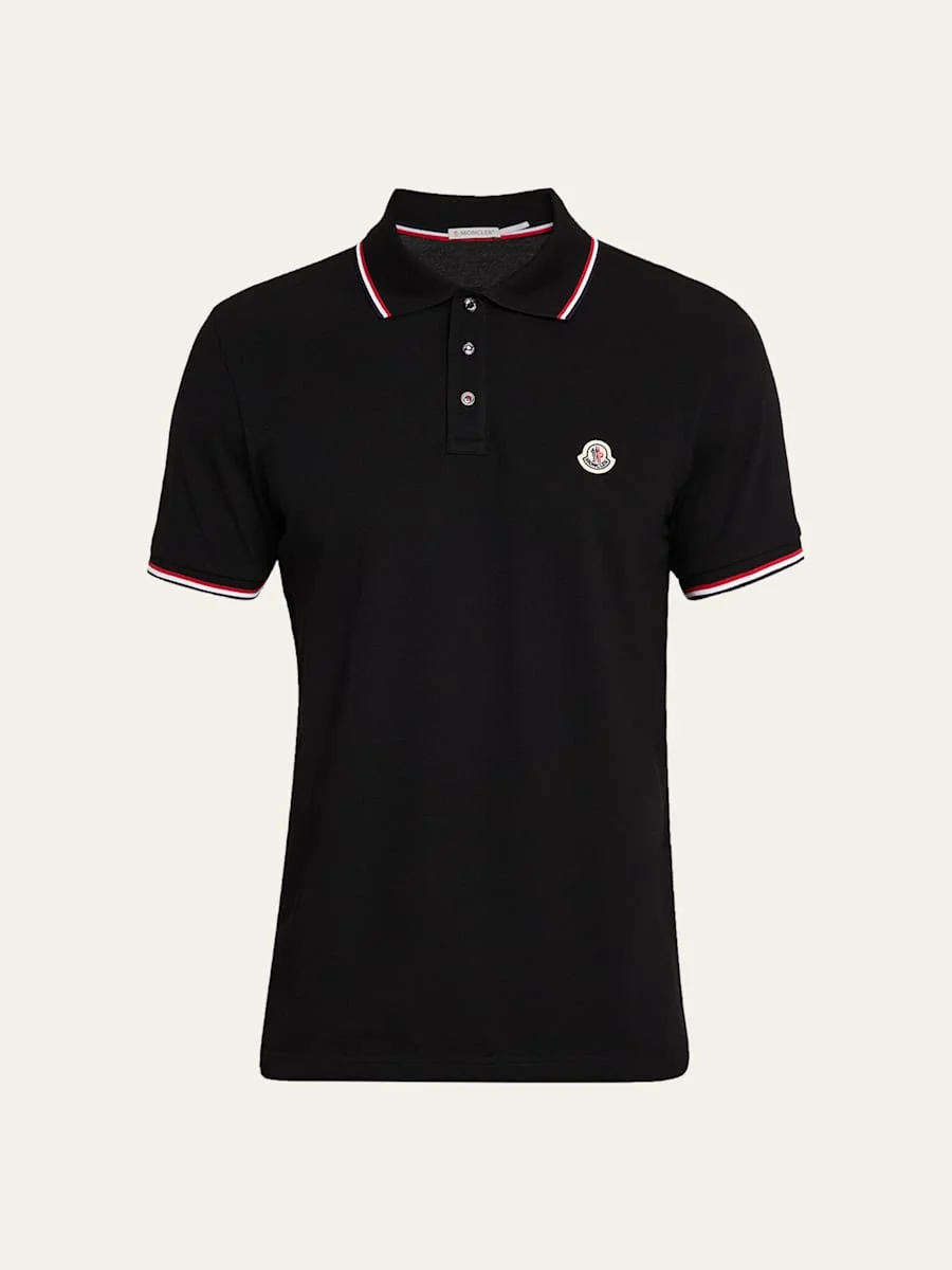 Moncler highlights this cotton pique polo with the brand's signature logo on the front and a tricolor trimming. Spread collar with striped trim Threebutton placket Logo patch on the chest Short sleeves Striped cuffs Pullover style Cotton Machine wash cold Imported