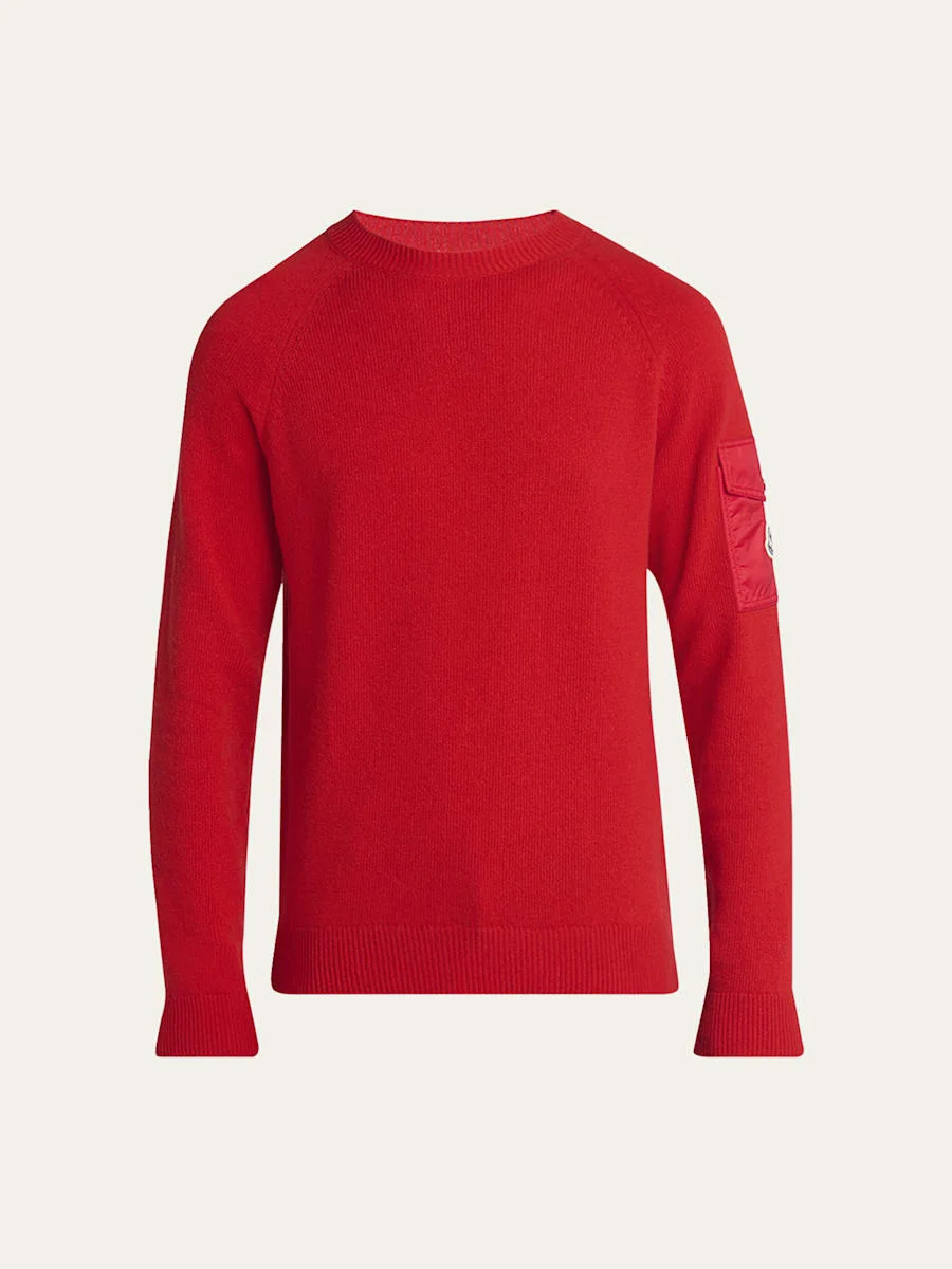 Moncler knit cashmereblend sweater defined a nylon flap pocket on the left sleeve with the signature emblem Ribbed crew neckline Long sleeves Ribbed cuffs and hem Pullover style Wool/cashmere/nylon Professional cleaning recommended Imported