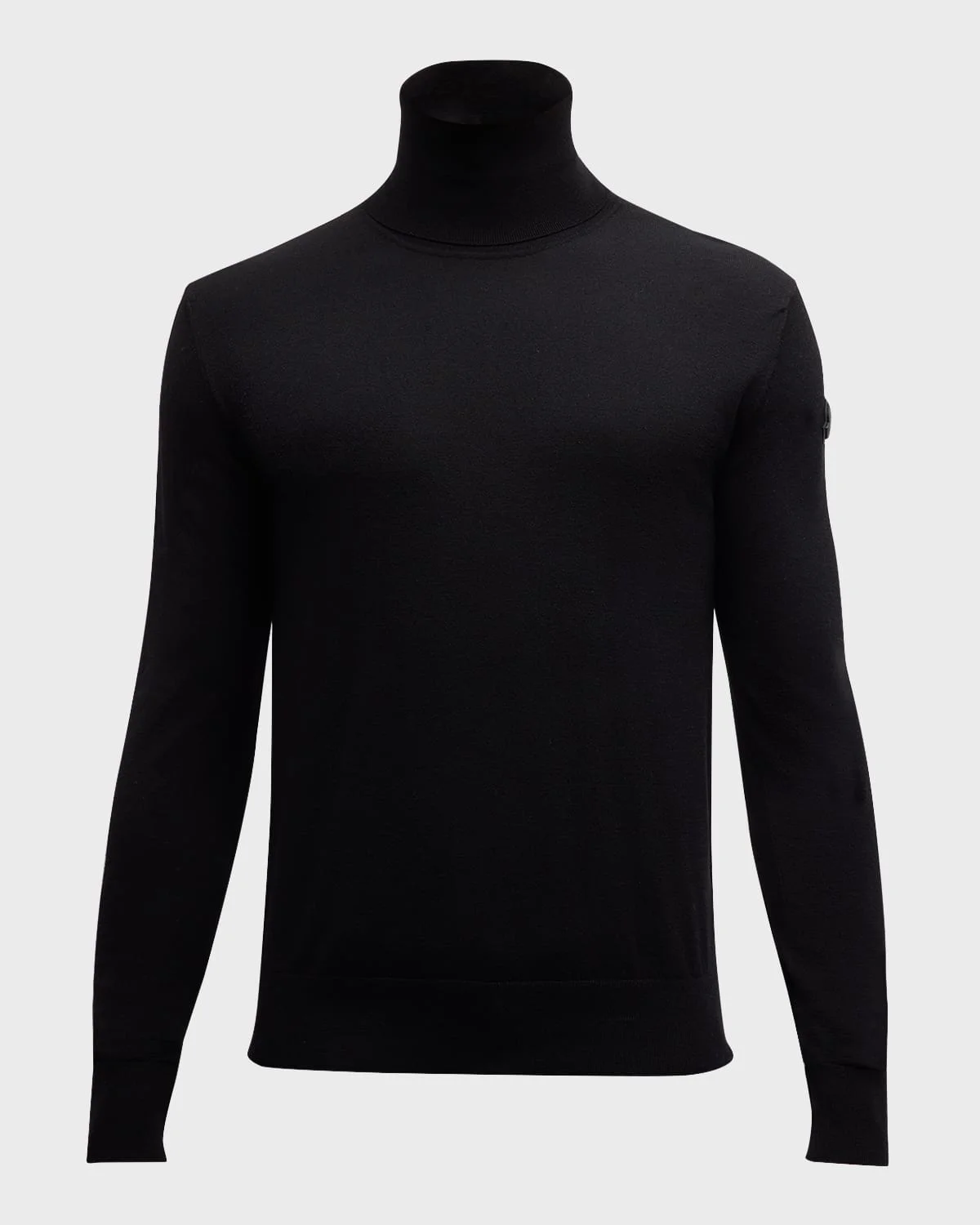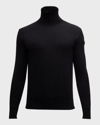 - Moncler solid sweater - Turtleneck - Long sleeves - Ribbed cuffs and waistband - Pullover style - Virgin wool/polyester - Dry clean - Made in Romania - Model is 6'1"/185cm.