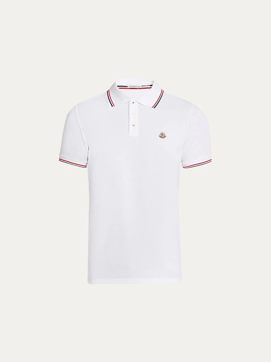 This Moncler cotton polo shirt showcases the archival logo on the chest, complete with the signature stripe trim Ribbed collar Threebutton placket Chest logo emblem patch Ribbed cuffs Pullover style Cotton Imported