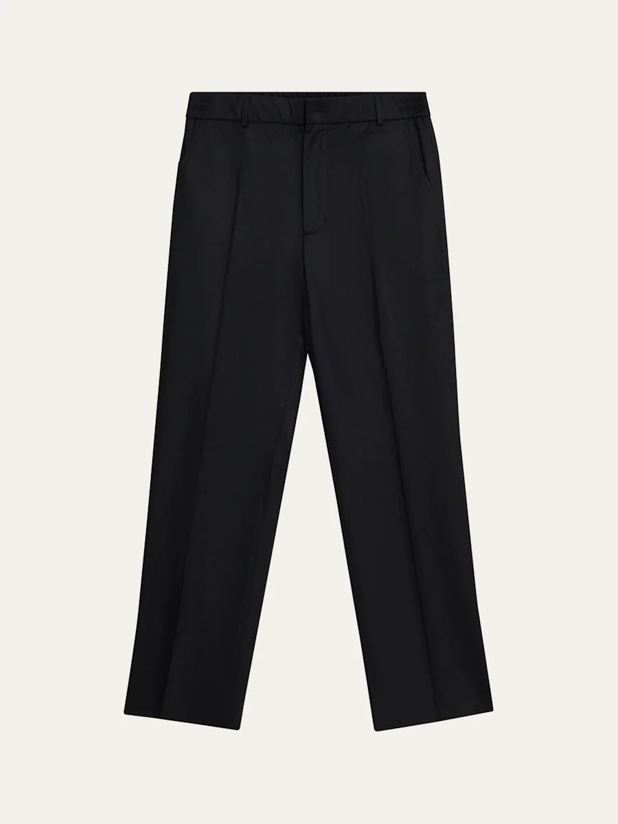 Tailored from virgin wool, these trousers by Moncler are finished with legelongating front and back pleats and a comfortable, elasticized waistband Regular rise Side slant pockets Back buttoned flap pockets Full length Straight legs Button/zip fly; belt loops Virgin wool Professional cleaning recommended Made in Romania