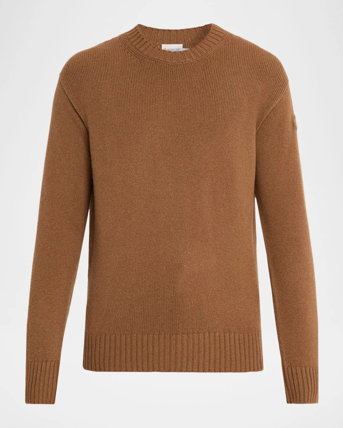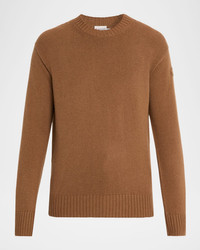 Moncler ultrasoft knit sweater defined by a leather logo emblem on the left sleeve Crew neckline Long sleeves Ribbed cuffs and hem Pullover style Virgin wool/cashmere/leather Unlined Professional cleaning recommended Made in Romania
