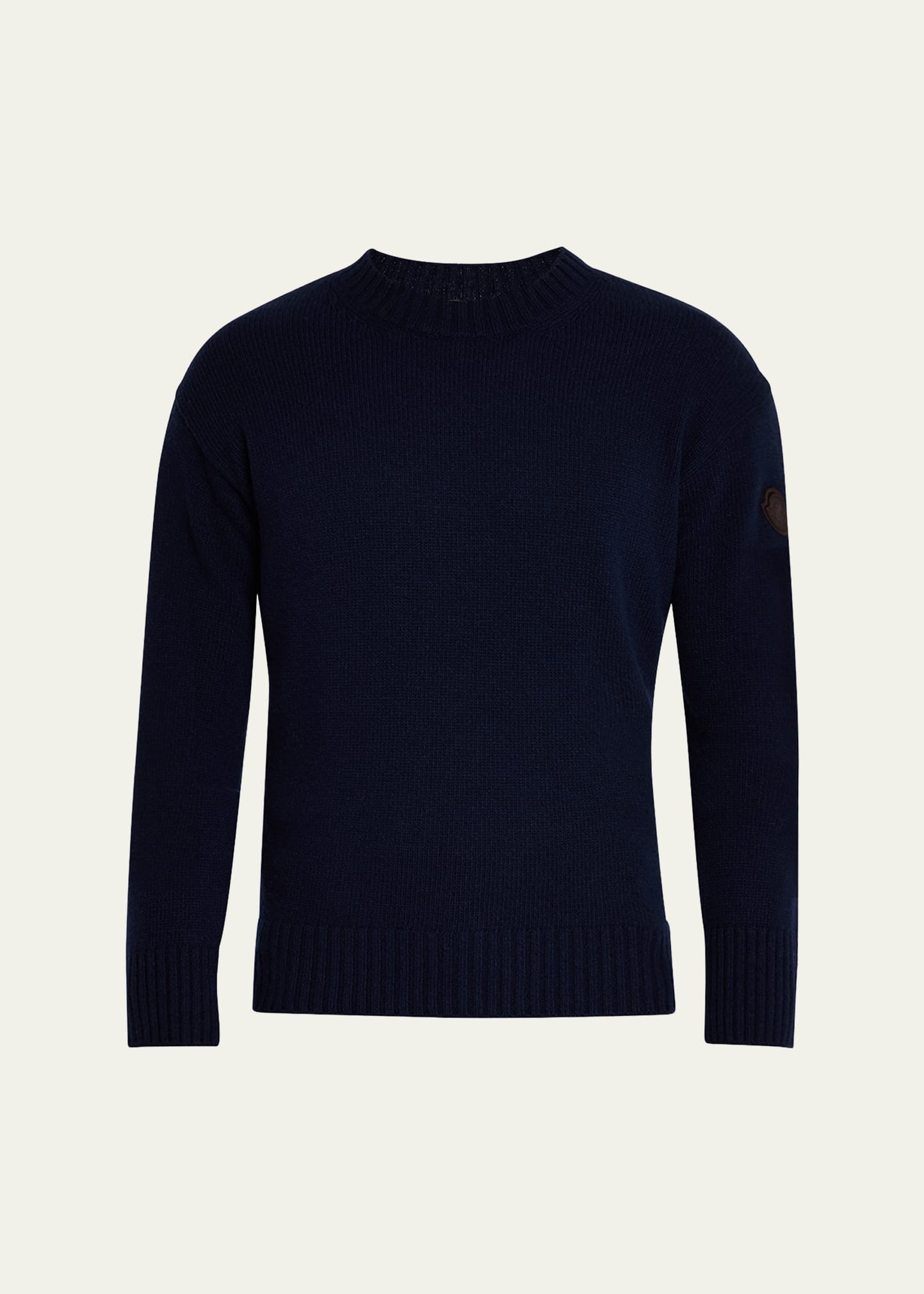 Moncler solid knit sweater Crew neckline Long sleeves Leather logo patch at sleeve Ribbed trim Pullover style Virgin wool/cashmere Unlined Dry clean Made in Romania Model is 6'1"/185cm. Online Inquiries: BGS21_NC8ZS| Store Inquiries: #4833608