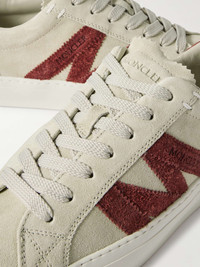 A reissue of Moncler's 'Monaco' sneakers, this pair is made from suede with a brushed 'M' placed at an angle on the sides. Modelled on classic tennis styles, they have pinked tongues and contrasting heels to match the branding on their uppers. Size & Fit - Fits true to size. Take your normal size - European sizing Details & Care - Beige and burgundy suede (Cow) - Lace-up - Style number: 4M002-40-M7633