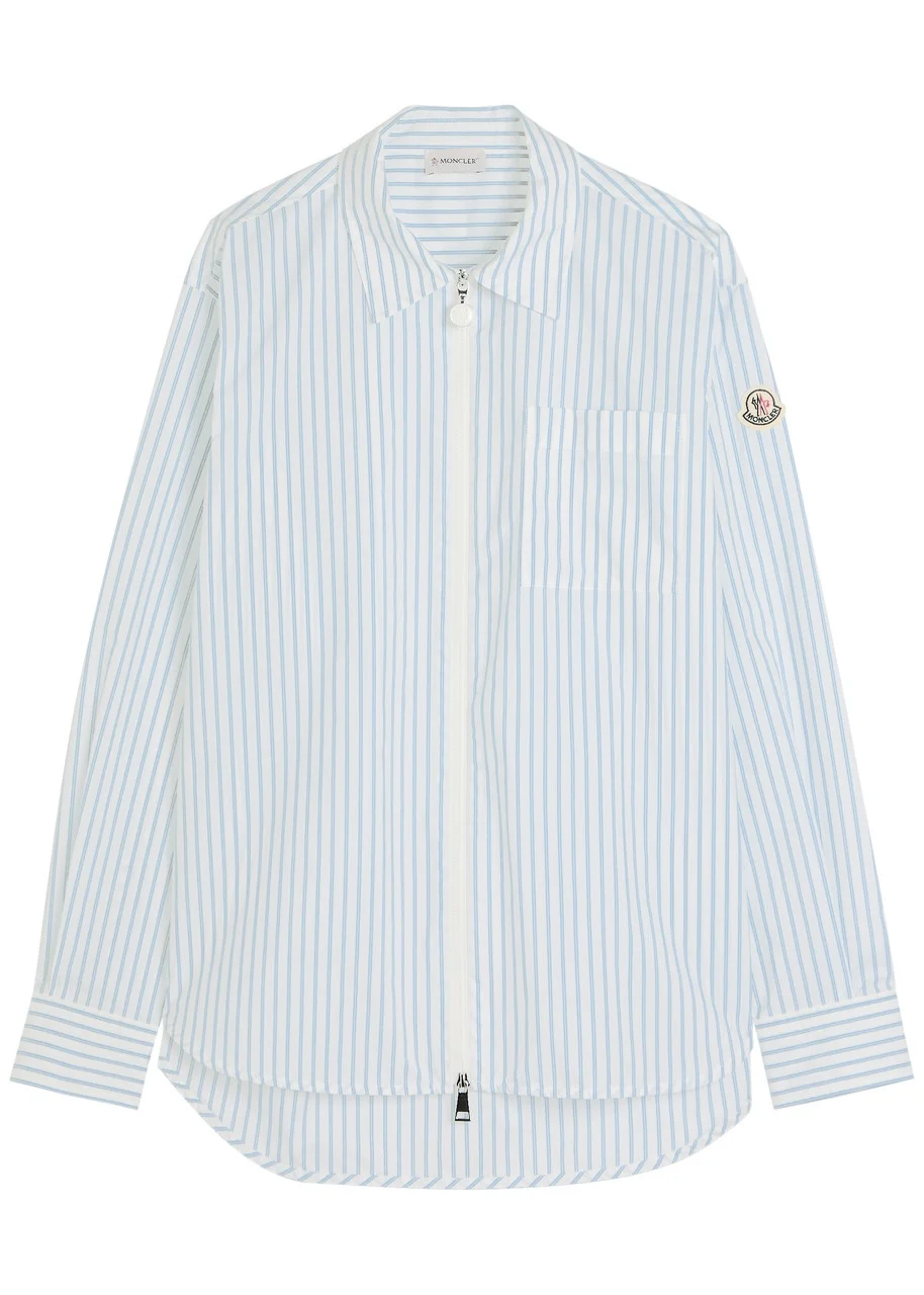 Info & Care Moncler shell shirt Striped, embroidered designer applique at sleeve, press-stud fastening cuffs, chest patch pocket, curved hem Two-way zip fastening at front; 100% polyamide Machine wash; Size & Fit Length shoulder to hem: 27.5 inches/ 70cm Midweight Loose fit Model is 5'9"/ 175cm and wears a size small