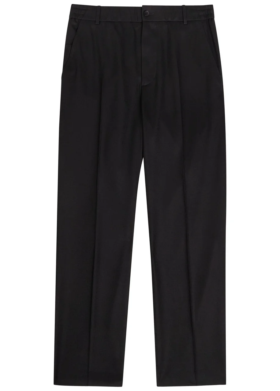 Info & Care Moncler wool trousers Concealed drawstring at partially elasticated waistband, belt loops, five pockets, pressed crease through legs, designer plaque at back Partially concealed button and zip fastening at front 100% virgin wool Dry clean Size & Fit Inside leg length: 32 inches/ 81cm Midweight Mid-rise fit, wide-leg cut Model is 6'2"/ 188cm and wears a size;IT48