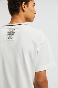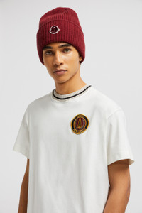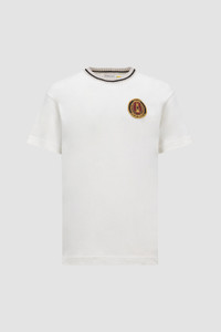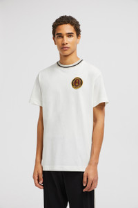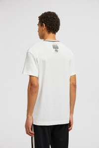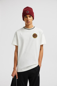 Drawing inspiration from the world of motorsports, this Moncler x Palm Angels t-shirt for men and women features a racing-inspired patch. Taking cues from racing driver's uniforms, this Moncler x Palm Angels t-shirt features an embroidered patch. Crafted from soft cotton jersey, the Moncler Genius crew neck further reflects the collection's sporty feel with a striped trim. DETAILS - Crafted from cotton jersey - Crew neck with striped ribbed trim - Short sleeves - Embroidered logo patches SIZE AND FIT - The male model is wearing a size L and is 190 cm tall - The male model measures: chest 89 cm, waist 70 cm, hips 90 cm - The female model is wearing a size XS and is 176 cm tall - The female model measures: bust 77 cm, waist 57 cm, hips 86 cm - Regular fit COMPOSITION BASE FABRIC: 100% Cotton; Ribs: 100% Cotton Product code J209L8C0000189AKK031 Made in Turkey