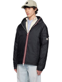 DIST-certified down-filled recycled nylon satin jacket. Water-repellant. · Bungee-style drawstring at hood · Striped trim at two-way zip closure · Zip pockets · Bungee-style drawstring at hem · Flap pocket and felted logo patch at sleeve · Adjustable press-stud tab at elasticized cuffs · Zip pocket at interior · Full quilted satin lining Supplier color: Dark navy blue Fill 1: 90% goose down, 10% feather. Fill 2: 100% polyester. Body: 100% nylon. Lining: 100% polyester. Made in Romania 251111M180044