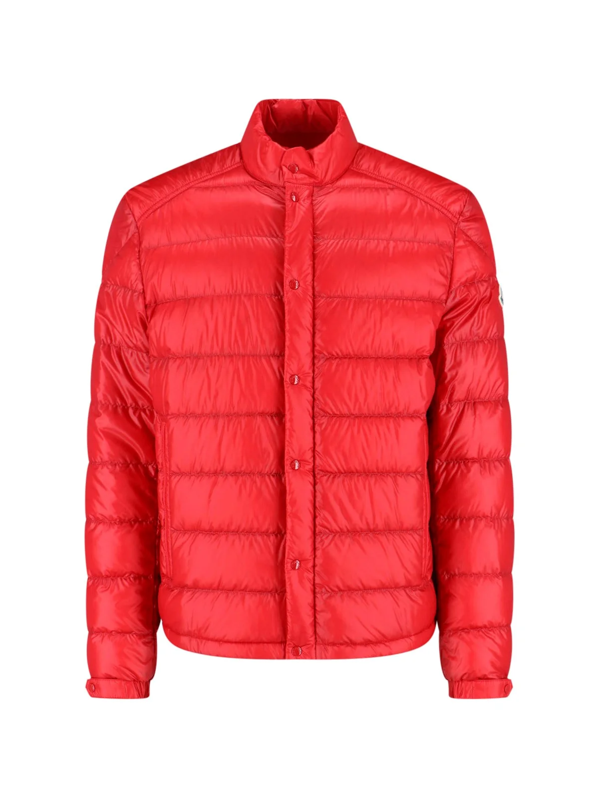 MONCLER 'SELVES' PADDED DOWN JACKET IN RED FABRIC WITH HIGH NECK, BUTTON CLOSURE, LONG SLEEVES, TWO SIDE ZIP POCKETS, MULTICOLOR LOGO PATCH ON THE SIDE ON THE SLEEVE, STRAIGHT HEM. PRODUCT INFO PRODUCT CODE 091 1A000 43 597Y4448 COMPOSITION: 100% POLYAMIDE SIZE AND FIT: REGULAR FIT MADE IN: MOLDOVA