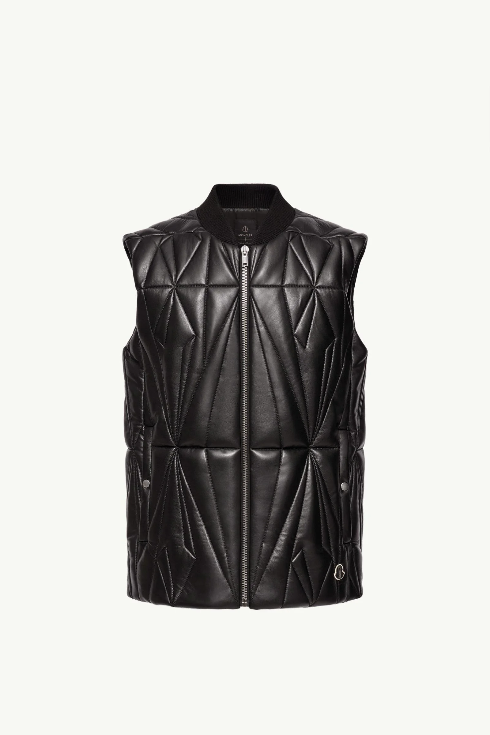 Refined construction and sharp lines give shape to the Moncler + Rick Owens Geocamo Flight Nappa leather vest for men and women. Echoing the geometry of city landscapes, the Geocamo Flight vest translates the language of quilting into sculpted Nappa leather. The unpadded construction highlights the material’s natural suppleness, while a back ribbon for shoulder carry adds a functional finishing touch. DETAILS - Crafted from Nappa leather - Ultra-light polyester lining - Wool blend knit trim - Zipper closure - Welt pockets with snap button closure - Inner zipped pockets - Ribbon at the back - Embroidered logo patch SIZE AND FIT - The male model is wearing a size 3 and is 188 cm tall - The female model is wearing a size 0 and is 179 cm tall - Regular fit - Fitted shoulders and chest - Boxy waistline - Length (collar to hem): 71 cm COMPOSITION LINING: 100% Polyester; COLLAR: 91% Virgin wool, 4% Polyamide / Nylon, 4% Polyester, 1% Elastane / Spandex; PADDING: 100% Polyester;LEATHER EXTERIOR: LAMB Product code L109N1A00010M8116999 Made in Italy