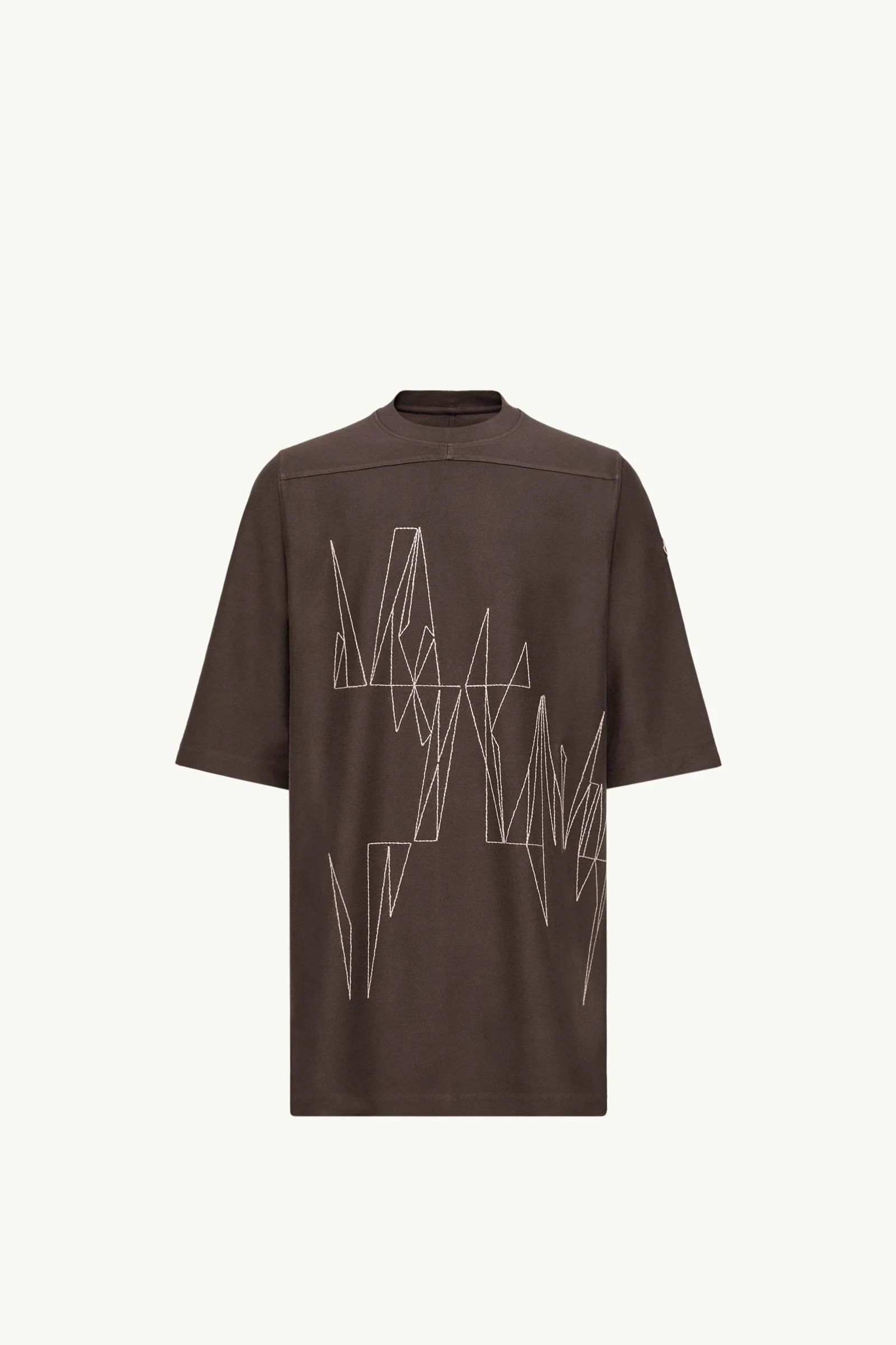 Translating the architectural rhythm of the metropolis, this cotton t-shirt for men and women is defined by a dynamic motif. Speaking to the intricate designs seen throughout the Moncler + Rick Owens collection, this crew neck t-shirt boasts a geometric stitching pattern. Presented in an oversized silhouette, the short sleeve design is crafted from cotton jersey. DETAILS - Crafted from cotton jersey - Crew neck - Short sleeves - Embroidered logo SIZE AND FIT - The male model is wearing a size L and is 188 cm tall - The female model is wearing a size XS and is 180 cm tall - Loose fit COMPOSITION BASE FABRIC: 100% Cotton; Ribs: 95% Cotton, 5% Elastane / Spandex Product code L109N8C0000489B7R256 Made in Turkey
