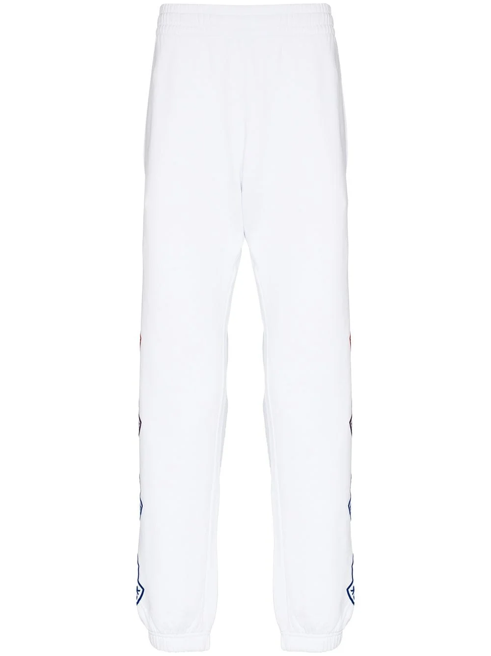 WHITE COTTON SIDE LOGO-PRINT TRACK PANTS FROM MONCLER FEATURING LOGO PRINT TO THE SIDE, LOGO PATCH TO THE REAR, ELASTICATED WAISTBAND, ELASTICATED ANKLES, TWO SIDE SLIT POCKETS AND REAR PATCH POCKET.