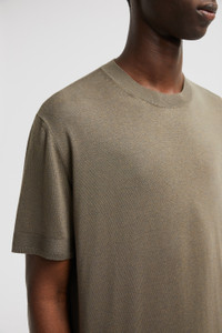 Spotlighting precious fabrics, this knit t-shirt from the men's collection is crafted from a silk and cotton blend. Elevating a daily essential, this t-shirt is knit from a luxurious silk and cotton blend. Ideal for balmy weather, the lightweight design features in a short sleeve silhouette. DETAILS - Crafted from a silk and cotton blend - Stockinette and Linz stitch - Gauge 18 - Crew neck - Short sleeves - Logo patch SIZE AND FIT - The model is wearing a size L and is 187 cm tall - Regular fit - Fitted shoulders and chest - Boxy waistline COMPOSITION BASE FABRIC: 55% Silk, 45% Cotton Product code K10919C00011M632982E Made in Romania