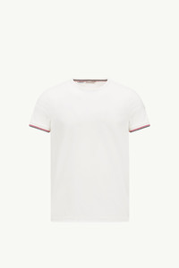 A wardrobe staple for every season, this men's short sleeve t-shirt features tricolor accents. Quintessentially Moncler, this t-shirt is elevated by signature tricolor accents. Crafted from cotton jersey, the short sleeve style comes in a classic crew neck silhouette. DETAILS - Crafted from stretch cotton jersey - Crew neck - Short sleeves - Tricolor trim SIZE AND FIT - Slim fit COMPOSITION BASE FABRIC: 92% Cotton, 8% Elastane / Spandex; Cuffs rib: 99% Cotton, 1% Elastane / Spandex Product code L10918C7160087296004 Made in Turkey