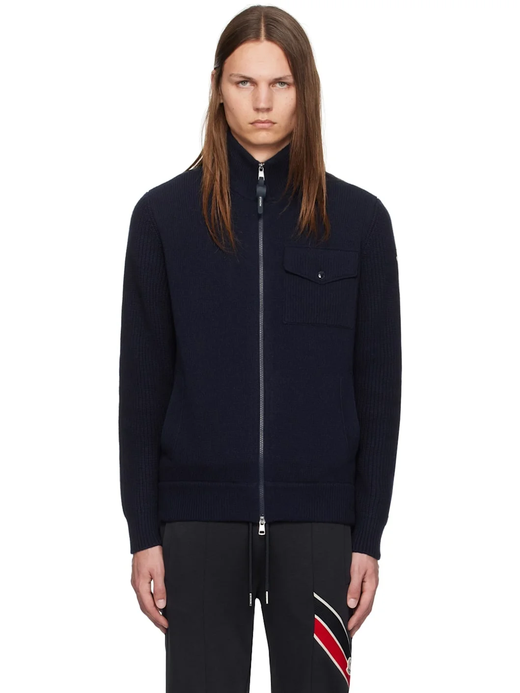 5-gauge stockinette-stitch knit virgin wool- and cashmere-blend cardigan. Down-filled nylon taffeta panel at back. · Rib knit stand collar, hem, and cuffs · Two-way zip closure · Flap pocket and welt pockets · Felted logo patch at sleeve · Partial taffeta lining · Logo-engraved silver-tone hardware Supplier color: Dark blue Fill: 90% goose down, 10% feather. Body 1: 90% virgin wool, 10% cashmere. Body 2: 100% polyamide. Lining: 100% polyamide. Made in Moldova 242111M202092