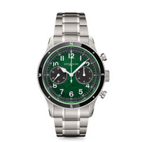 Capturing the spirit of mountain exploration and the beauty of Antarctica’s glacial landscape, the sfumato green glacier pattern dial of this Montblanc 1858 Automatic Chronograph 0 Oxygen is inspired by the deep green colour of the emerald icebergs or “jade bergs”. The timepiece is housed in a 42 mm stainless steel case totally devoid of oxygen. The dial is adorned with a bi-compax chronograph configuration with a black small seconds display at 9 o’clock and a black 30-minute chronograph counter at 3 o’clock. Matching the sub dials, this timepiece comes with a black bi-directional ceramic bezel with luminescent cardinal points. It is fitted with an interchangeable stainless steel bracelet with taper and fine adjustment system and an engraved case back featuring the “Spirit of Exploration” special engraving. Ident No. MB133298 Movement MOVEMENT TYPE Automatic movement Chronograph POWER RESERVE 48 h FREQUENCY (VPH) 4 /h FREQUENCE (HZ) 28800,0 Hz NUMBER OF JEWELS 27,0 Jewels Case CASE MATERIAL Stainless Steel CASE DIAMETER 1.65 inches CASE HEIGHT 0.58 inches WATER RESISTANT 10 bar (100 m) bar BEZEL Bi-directional turning bezel BEZEL MATERIAL Stainless steel and ceramic SAPPHIRE CRYSTAL Domed glass box with anti-reflective coating DIAL Green sfumato glacier pattern dial with white luminescent rhodium-coated Arabic numerals