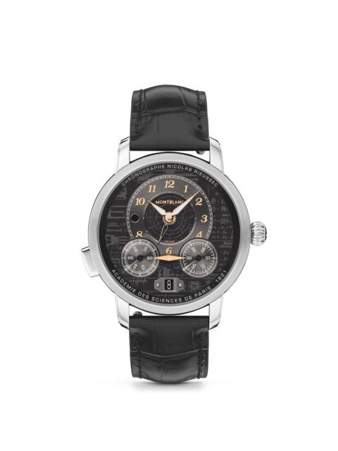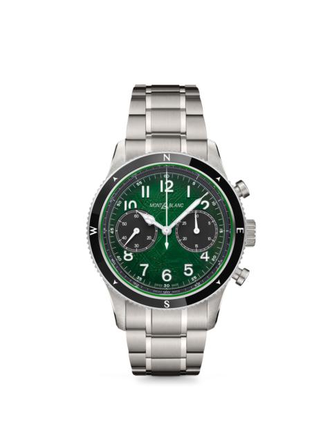 Capturing the spirit of mountain exploration, the sfumato green glacier pattern dial of this Montblanc 1858 Automatic Date 0 Oxygen is inspired by the deep green colour of the emerald icebergs or “jade bergs”. The timepiece is housed in a 41 mm stainless steel case totally devoid of oxygen with a fixed black ceramic bezel with luminescent cardinal points. It is fitted with an interchangeable stainless steel bracelet with taper and fine adjustment system and an engraved case back featuring the “Spirit of Exploration” special engraving. Ident No. MB133269 Movement MOVEMENT TYPE Automatic movementHours - Minutes - Seconds - Date POWER RESERVE 38,0 h FREQUENCY (VPH) 4 /h FREQUENCE (HZ) 28800,0 Hz NUMBER OF JEWELS 26 Jewels Case CASE MATERIAL Stainless Steel CASE DIAMETER 1.61 inches CASE HEIGHT 0.44 inches WATER RESISTANT 10 bar (100 m) bar BEZEL MATERIAL Stainless steel and ceramic SAPPHIRE CRYSTAL Domed glass box with anti-reflective coating DIAL Green sfumato glacier pattern dial with white luminescent rhodium-coated Arabic numerals and indexes